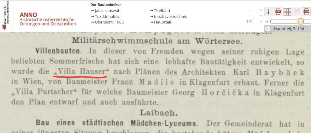 Quelle: ANNO, Österreichische Nationalbibliothek „Der Bautechniker“ 1905 Errichtet wurde die Villa vom Baumeister Franz Madile, der mit Haybäck viel zusammenarbeitete. Die Baufirma Madile gibt es heute noch in Klagenfurt, wird inzwischen in vierter Generation geführt und feierte ihr 125-jähriges Bestehen. Diese Zusammenarbeit brachte zahlreiche Villen am Wörthersee und in Klagenfurt hervor. Eine Publikation aus dem Jahr 1905 berichtet über die neu erbaute „Villa Hauser“ in unmittelbarer Nähe der damaligen Militärschwimmschule.  Foto um 1960
