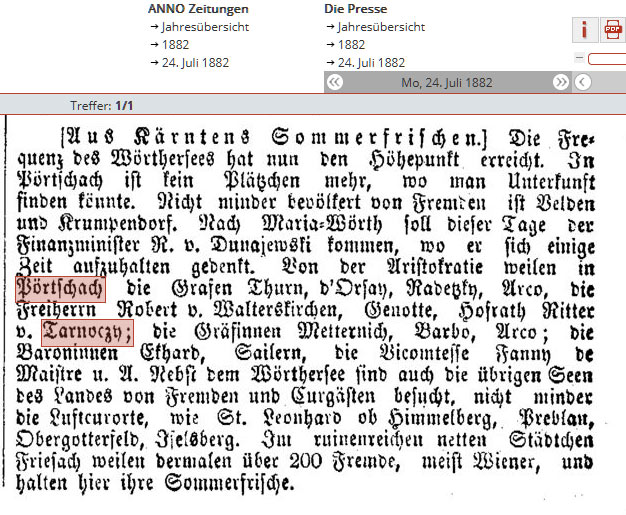 Im Juli 1882 erreicht der Wörthersee seinen Besucherhöhepunkt. Pörtschach, Velden und Krumpendorf sind überfüllt, Unterkünfte fehlen. Zahlreiche Adelige verweilen zur Sommerfrische. Auch andere Seen und Luftkurorte Kärntens sind stark besucht.