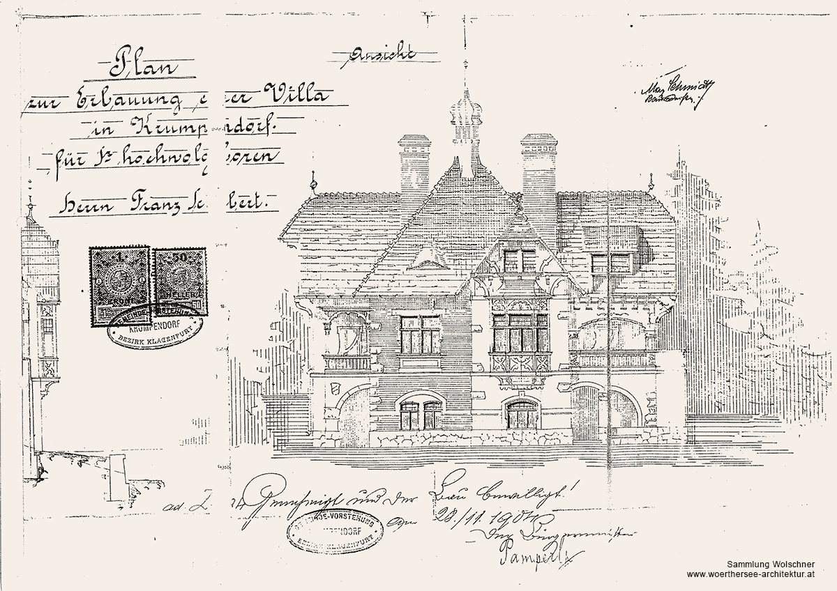 Plan Ansicht Süd "Plan zur Erbauung einer Villa in Krumpendorf für hochwohlgeboren Herrn Franz Schubert." Unterschrieben 28.11.1904 von Bürgermeister Pamperl und Baumeister Max Schmidt.