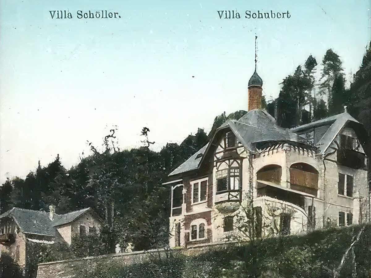 Die Villa Schubert liegt neben den drei Villen Schöller, wobei auf dieser historischen Postkarte von 1909 die östlichste der Villen zu sehen ist. Die Loggia im OG wurde später verglast und der Stiegenaufgang zur Loggia entfernt.