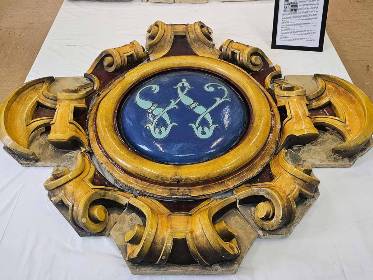 Medaillon aus dem Giebelfeld der Villa Wahliss, Foto 2025 Keramikmedaillon mit dem Wahliss-Emblem „W“ in kräftigem Blau, umrahmt von goldgelber Farbe. Das Medaillon ist bis heute in farbenfrohem Zustand erhalten. Es wurde 1976 beim Abriss der Villa von Ing. Napetschnig geborgen. Derzeit ausgestellt in der „Wahliss“-Ausstellung im Bahnhof Pörtschach.
