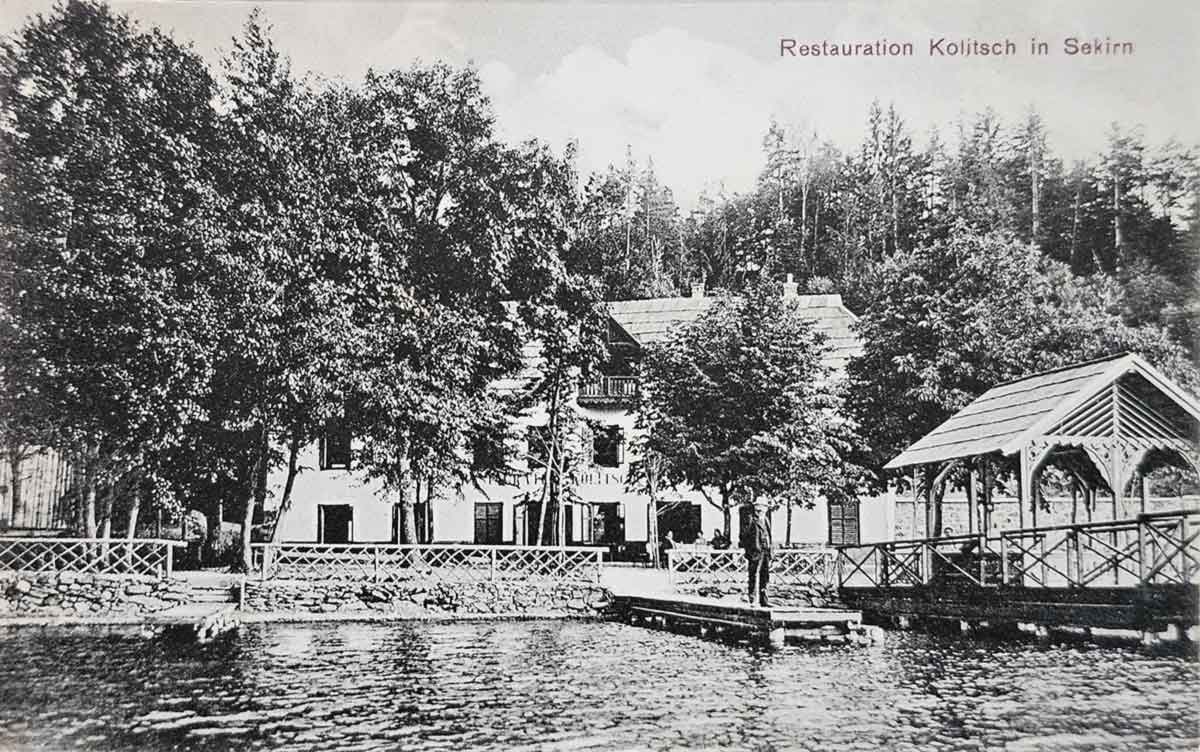 Die "Restauration Kollitsch in Sekirn", direkt am Seeufer mit Steg und hölzernem Seepavillon im Schweizer Stil. Eine Ansichtskarte aus dem Jahr 1912 zeigt dieses charmante Ensemble.