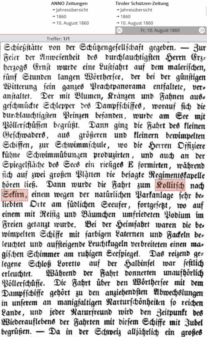 Dann wurde die Fahrt zum Kollitsch nach Sekirn, einem wegen der natürlichen Parkanlage sehr beliebten Orte am südlichen Seeufer, fortgesetzt, wo auf einem mit Reisig und Bäumchen umfriedeten Podium im Freien getanzt wurde. Bei der Heimkehr waren die bewimpelten Schiffe mit farbigen Laternen und Fackeln beleuchtet und aufsteigende Leuchtkugeln verbreiteten einen magischen Schimmer am ruhigen Seespiegel. Das reizend gelegene Schloss Loretto auf der Halbinsel war festlich erleuchtet.