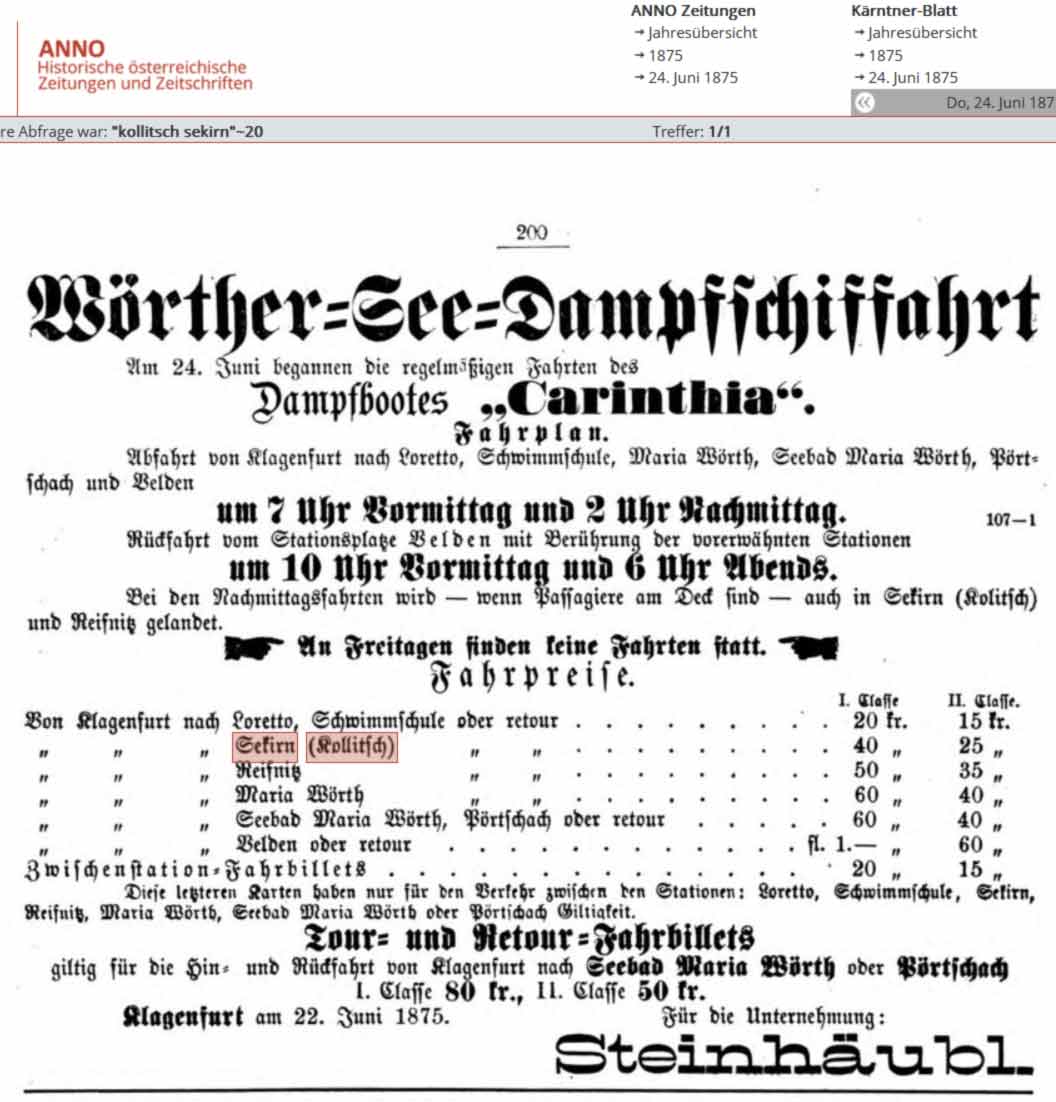 1875 Fahrplan Wörther See Dampfschiffahrt. Dampfboot "Charinthia" Eigene Schiffs-Station Sekirn Kollitsch.